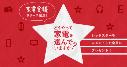 ※ キャンペーンは終了しました。たくさんのご応募、ありがとうございました。家電選びマスター賞の発表とカラースターの配布は、こちらをご覧ください。先日オープンした家電ニュースコミュニティ「家電会議」はもうご利用いただけましたか?家電会議リリー…